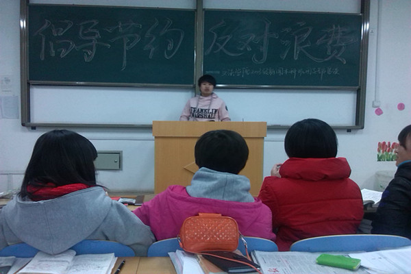 2013年12月11日晚19:00,文法学院2013级新闻本科班在图书馆407室举行“厉行节约,反对浪费”主题恳谈会议。