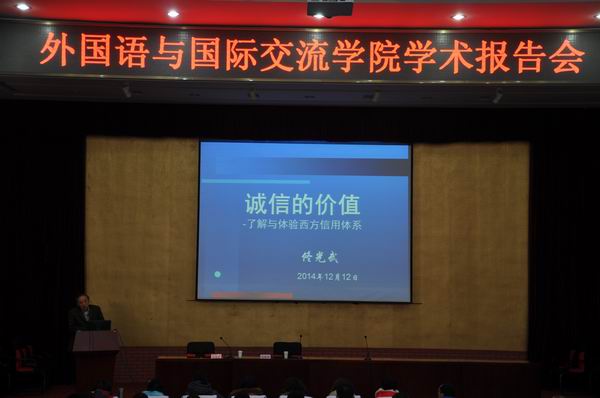 12月12日,山东大学国际合作与交流处原处长佟光武教授来校,在学术报告厅为我院师生学生作了“诚信的价值―了解与体验西方信用体系”专题学术报告,外国语与国际交流学院全体教职工及基层团委、学生会骨干参加了此次学术报告会。