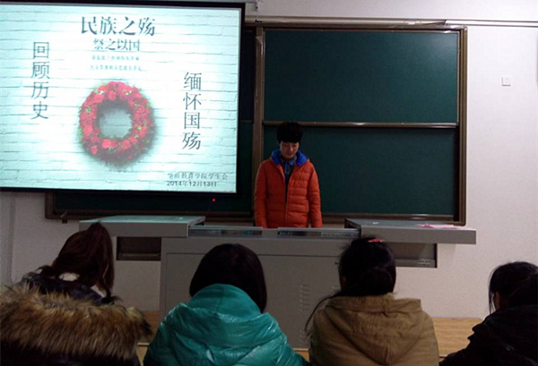 学前教育学院学生会组织了以“回顾历史 缅怀国殇 ”为主题的线下交流活动,参与交流活动的同学首先观看了有关南京大屠杀的纪录片,在场的各位同学在观看时无不面露气愤与感伤。良久之后,全体起立,为祖国的遇难同胞默哀,默哀后同学们积极的参与讨论,在缅怀先烈的同时,纷纷表明会更加自立自强,为实现伟大的中国梦而奋斗!在举行“回顾历史缅怀国殇 ”为主题的线下交流活动后,大家一起观看团省委的微博直播,并且纷纷加入线上讨论,在学前教育学院学生会的引导下,学前教育学院14级新生自发组织在宿舍观看团省委的微博直播,看着一条条微博的出现,大家纷纷拿起手机一起参与线上讨论,共同缅怀祖国先烈。