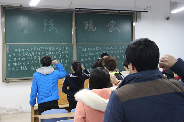 为了丰富同学们的法律知识和提高他们的自我保护能力,引导学生们树立宪法意识,增强宪法观念,文法学院于2014年12月4日晚7点在法律各班举行了普法晚会。