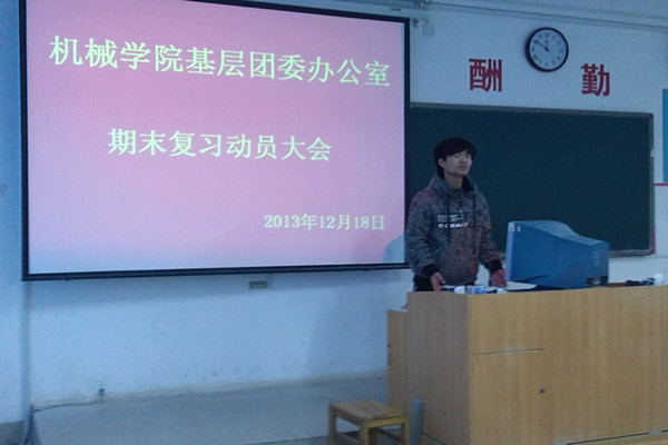 为了让团学干部们取得一个好成绩,机械学院基层团委办公室在机械学院实训北楼4015举行“期末考试动员大会”,参加本次动员大会的有基层团委办公室主任和所有办公室干事。会议由办公室主任段文星主持召开。