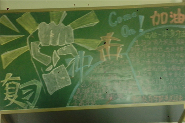在板报制作的过程中,负责制作的三人分工合作:一个人负责写字,字的主要内容是教学生一些复习的方法,另外两个人负责画画,画的部分由一只有力的手和艺术字标题构成,体现出认真复习的核心思想。四人积极配合,板报在两个小时内就完成了,最后拍照留做纪念。