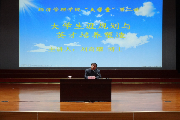 为让大学生更好地掌握人生方向的罗盘,做到“我的大学我做主,我的人生我负责”。2014年11月25日晚,北校区大学生活动中心迎来了经济管理学院“大学堂”的第二讲。本场讲座邀请山东财经大学团委书记刘奇耀博士作为主讲嘉宾,以“大学生涯规划与英才培养塑造”为主题做了精彩的演讲。经济管理学院行政副院长王广柱、基层团委书记赵昆以及2011级、2012级、2013级部分学生参加了本场讲座。