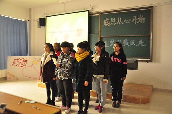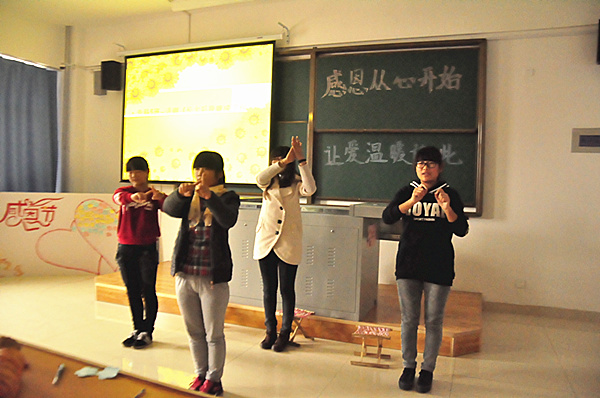 在了解西方感恩节的由来以及相关风俗习惯的同时,主办方希望大家通过此次活动在未来可以怀着一颗感恩的心生活。同学们已经就位,等待活动的开始。活动中有全场的互动节目,主持人向同学们发放心愿纸,他们认真写下自己的心愿,将填满的心愿纸贴到感恩板上,然后大声说出感恩宣言,他们真诚感谢了自己想要感谢的人。接下来是各班级精心准备的感恩节目。有动听的歌曲《每当我走过老师窗前》、《报答》,有感人泪下的话剧《天亮了》、《感谢有你,我的老师》,还有激情澎湃的朗诵《这就是爱》、《感恩父母》、《学会感恩》、《祈祷》。最后一个节目是由科技创新部成员表演的手语《感恩的心》,他们用流利的打法,浑然天成的表演,温柔地向同学们传递感恩的信息。此次感恩节活动受到了同学们的热烈欢迎,同学们纷纷踊跃参加,在感恩节送出自己的祝福!下午一点,感恩节活动结束,全体演员合影留念,为此次感恩节活动画上圆满的句号。