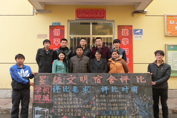 学生公寓作为学生生活和学习的重要场所,是大学生人格完善与综合素质提升的重要阵地。为充分发挥学生宿舍的教育、导向、凝聚、激励、约束力等功能,创建干净整洁、健康和谐的公寓环境,做好“打造特色宿舍文化,营造和谐宿舍氛围”文明宿舍评比活动。机械学院行政院长孔祥泉、秘书、辅导员与学生共同打造公寓特色文化,开展公寓卫生秩序大检查,帮助、督促学生积极参与以“创平安公寓,建学习阵地”为主题的争做文明宿舍活动。