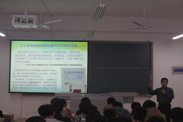 为使广大师生更好地把握新能源汽车的发展现状与未来路径,熟悉汽车产业发展的总体方向,由汽车工程学院主办的“新能源汽车发展现状与未来”的学术报告会,于2014年11月24日在汽车工程学院实验实训楼成功举行。本次报告邀请到了新能源汽车技术发展方面的专家刘艾清博士开讲,学校部分师生出席报告会。
