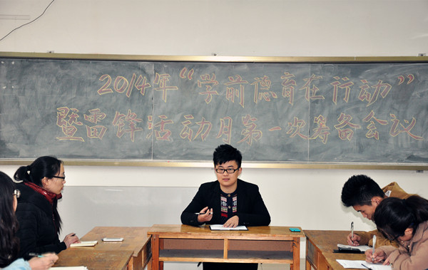 2014年3月1日早上九点,学前教育学院召开了“学前教育学院德育在行动暨雷锋活动月”第一次筹备会议。学生会主席张丰出席并主持本次会议,基层团委常务副书记盖敏敏、副书记王军均出席参加,参加本次会议的还有学生会各副主席、各部门部长。