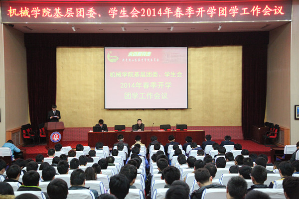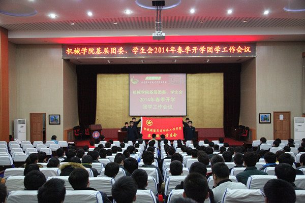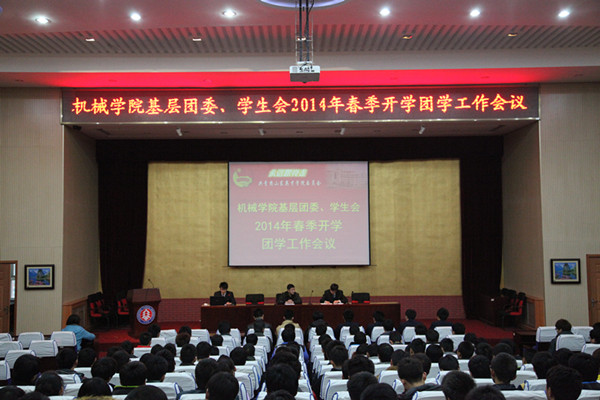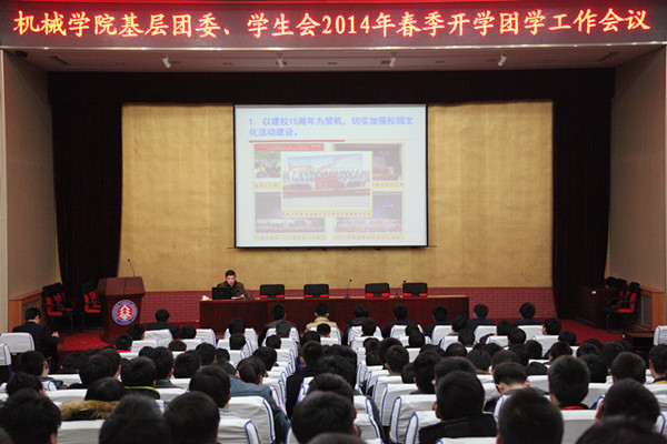 新学期,新气象,新发展,为继续加强大学生思想政治教育工作,使学生干部以身作则,准确定位自己,进而更好的开展工作,3月2日下午机械学院基层团委学生会在学术报告厅召开2014年春节开学团学工作会议。机械学院基层团委书记刘阁、各常委、各部长、机械学院学生会主席团、各部长以及机械学院基层团委、学生会全体团学干部参加了本次会议。会议由基层团委副书记崔胜桥主持。
