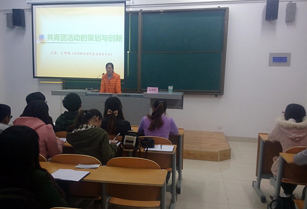 2014年11月10日晚6:30在学前实训教学楼6006教室,由学前教育学院基层团委书记王坤丽主讲的“共青团活动的策划与创新”――新生骨干培训第四讲准时召开。