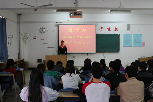 2014年3月19日。商学院于综教楼4010召开副书记恳谈会。此次会议的主题为“与信仰对话,青春与谁同行”。参加此次会议的有商学院基层团委副书记江秀阳,基层团委学生会全体成员。