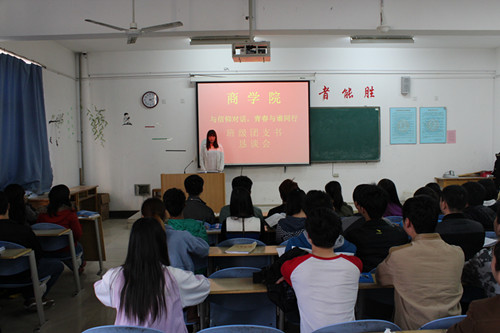 河流的信仰是宽阔的海洋,鸟儿的信仰是蓝天上飞翔,黎明的信仰是明亮的太阳,冬天的信仰是温暖的春光。2014年3月20日。商学院于综教楼4010召开班级团支书恳谈会。此次会议的主题为“与信仰对话,青春与谁同行”。参加此次会议的有商学院市场营销高职1班团支书杨秋莹,市场营销高职1班全体同学。