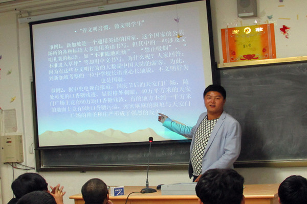 为创建以人为本的科学发展观的核心价值观,营造积极向上、文明礼貌、舒适优雅的校园文化环境,进一步培养学生良好的行为习惯,形成良好的班风、学风、校风,让学生处于一个良好的学习生活氛围中。在2014年10月27日晚六点信息工程学院辅导员位高飞在B-1011开展了“大学生文明礼仪”的主题班会,旨在培养学生良好的道德文化修养。