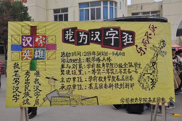 2014年3月28日中午在大学生活动中心门前广场,学前教育学院基层团委科技创新部举行了“我为汉字狂”的拼写大赛启动仪式及其现场模拟。参加此次启动仪式的有学前教育学院基层团委书记王坤丽,学生会主席张丰,基层团委常务副书记盖敏敏,学生会副主席孔维婷,还有学生会、基层团委的各个部长及团委四个部门的选手代表和科技创新部成员们。