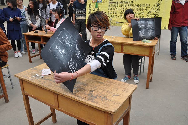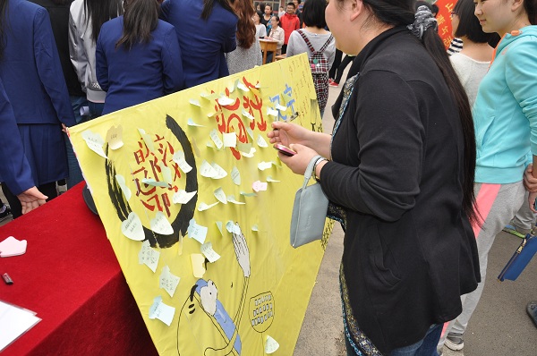 三月暖春,时间送来了温情的告白。在这个让人温暖的季节里,基层团委科技创新部策划了“我为汉字狂”汉字拼写大赛。为了让此次活动更加有力地体现它自身所存在的价值,科技创新部开展了启动仪式及其现场的模拟。紧张的准备工作让每一位同学忙里忙外,有搬桌子、搬凳子、抬黑板、伸条幅、抬展板等一系列工作,虽然累点,但是在同学们的脸上都反馈出希望此次举行仪式圆满完成的样子。每一位同学虽然饿着肚子,但也从没有放下手中的工作,认认真真、踏踏实实地做着有序的现场工作;正在路上的学生们也很给力,停下自己的脚步,来积极参与此次活动的启动仪式,工作人员给他们便利贴,让他们写下自己所认为的“最美汉字”或者是自己的祝福语。不一会儿功夫,偌大的方形展板贴得满满的;最重要也是最引人注目的场面则是此次汉字拼写大赛的模拟活动,有大气的主持人,公正的评委及计时人员,严谨的规则,这都为此次模拟活动增加了一大看点。同学们的积极拼写,评委的公平裁决,计时人员的“精打细算”让每一轮的淘汰模拟赛都变得正规而不乏趣味。模拟活动有条不紊地进行着,路上的行人也不由得驻足来参与此次活动的现场模拟。