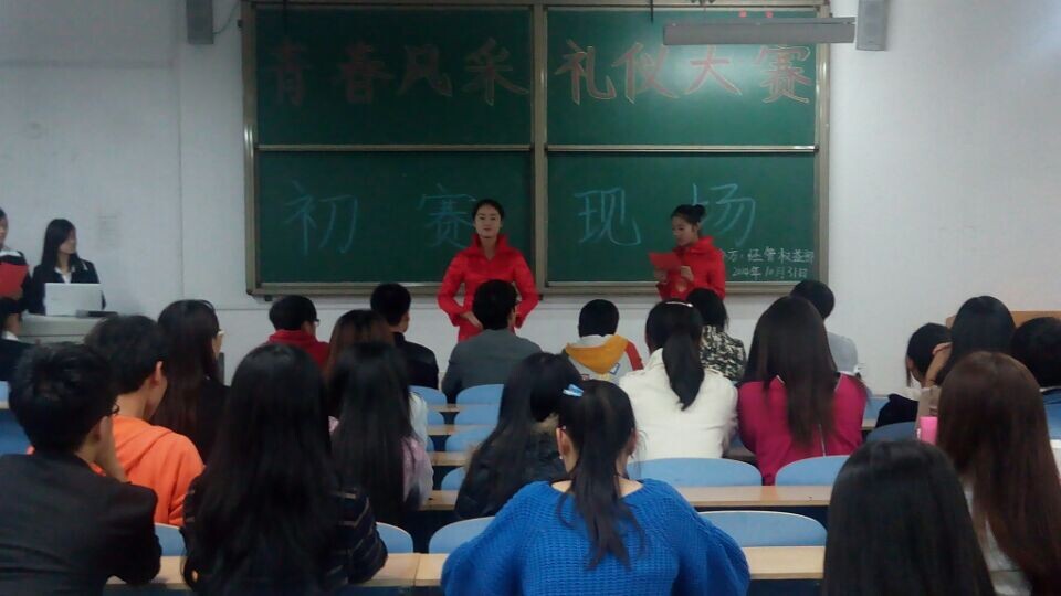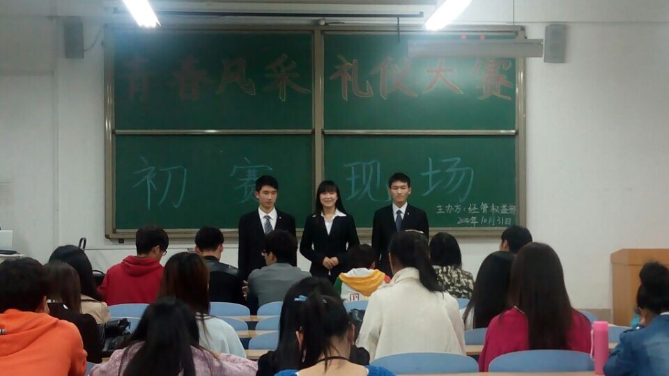 为丰富大学生的课余生活,展示当代大学生的个性风采,打造一批闪亮的校园礼仪之星,2014年10月31日下午五时,以经济管理学院学生会权益部承办的第六届科技文化艺术节青春礼仪风采大赛在教学楼B-106拉开了帷幕。出席本次活动的有经济管理学院基层团委、学生会办公室副主任韩国栋、杨鑫,文艺部副部长韩佩锦等五位评委。