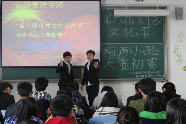2014年10月31日 ,经济管理学院在教学楼B-504举办了第六届校园科技文化艺术节之相声小品大赛初赛。本次比赛有经济管理学院基层团委社会实践部主办,社会实践部部长张顺成、艺术团语言部副部长杜新宇、宣传部副部长孙芳玉等作为本次比赛的评委嘉宾。
