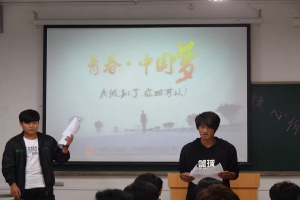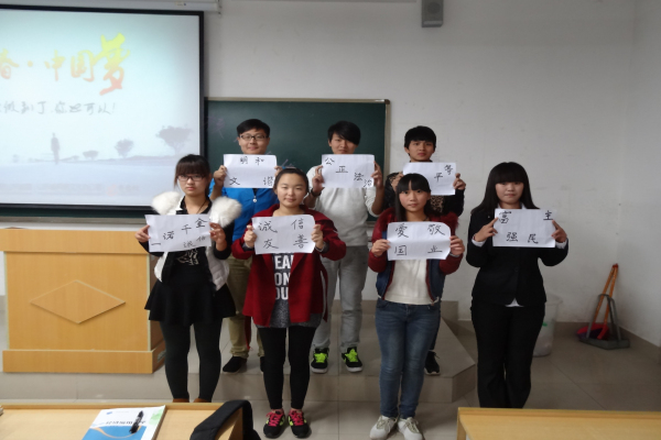 首先由团支书邹杰对此次班会进行阐述,讲述了“中国梦•我的梦”。同时也通过PPT进行展示,同学们也积极讲述了自己的梦想。接着在团支书的组织下,学习委员王亚楠和组织委员姜丽娟讲述了社会主义核心价值观的内容与理念。紧接着同学们进行互动:先是全体进行宣誓,接着同学们通过纸片的形式阐述社会主义核心价值观,随后同学们也积极主动的在黑板上签字。随后班长进行总结并带领大家共同背出社会主义核心价值观的核心内容。同时班长讲述社会主义核心价值观的重要性,要树立良好的形象做好榜样,要付出实际行动。最后在大家感谢此次班会的工作人员的热烈掌声中班会圆满结束。