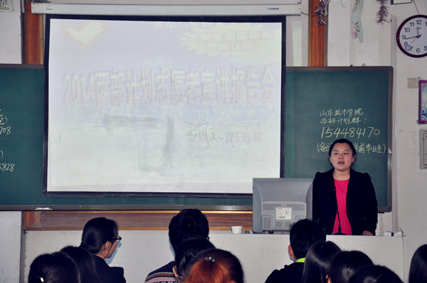 为进一步做好2014年西部计划志愿者招募工作,引导和鼓励更多的优秀大学毕业生响应团中央“到西部去、到基层去、到祖国和人民最需要的地方去”的号召,投身开垦建设西部的伟大事业,学前教育学院基层团委于2014年4月16日中午在教学A楼5001教室举办2014年西部计划志愿者宣讲报告会。学前教育学院基层团委书记王坤丽老师、常务副书记盖敏敏、副书记王军,学生会主席张丰,副主席左曙光、范江涵、孔维婷、王敏敏,以及有意愿投身西部计划的学生代表们共同聆听了此次报告会。