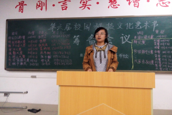 本次活动由各部长以幽默的氛围为各班负责人讲解了各活动的内容、要求以及比赛时间。每个人都以认真的态度对待本次会议,相信通过本次会议,第六届科技文化艺术节会举办的更好。相信各位同学能各展风采,成为学校的最亮丽的风采。