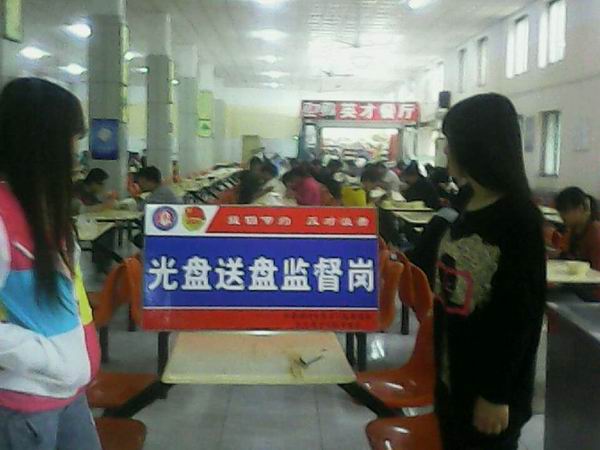 近日,外国语与国际交流学院基层团委成了光盘行动监督小组,,在学院第二食堂的就餐大厅里,由外国语与国际交流学院基层团委开展的监督“光盘行动”实施情况的活动如火如荼地进行中。