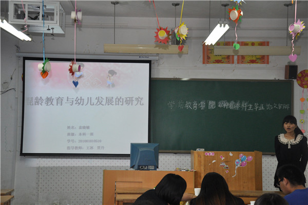 2014年5月21日 下午,山东英才学院学前教育学院10级本科生在A楼进行毕业论文答辩。学前教育学院部分校领导和专业课老师检查答辩环节安排并现场听取学生答辩,深入了解本科毕业生设计(论文)撰写质量和答辩水平,并当场及时指出该环节管理过程中存在的问题。在答辩现场,学院领导提出要求:要严格按照评审标准对学生毕业设计(论文)进行评分,客观、全面地提出学生设计(论文)存在的不足之处,以此作为学生再次修改毕业设计(论文)的依据,整体提高本科毕业生毕业设计(论文)撰写质量。