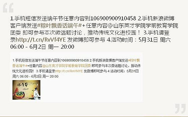 为了弘扬中华民族优秀传统文化,让当代大学生更深入地学习传统文化,了解传统文化,学前教育学院基层团委于端午节期间特举办了“粽叶飘香话端午”新浪微博线上活动,用新媒体的力量推动传统文化进校园。