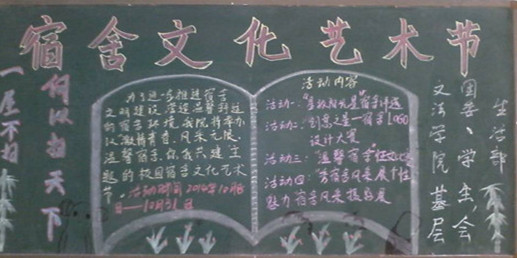 举办此次活动旨在全面提高学生综合素质,增强学生文明修养,丰富大学生宿舍文化生活,展现我院学子生活创新、积极上进的风貌,提高宿舍文化品位,陶冶学生情操,创造绿色环境,营造温馨、健康、活泼、文明的生活氛围,增强团队合作精神和宿舍成员间的集体凝聚力。基层团委、学生会生活部成员为了宣传宿舍文化艺术节,在图书楼三楼大厅里制作了宿舍文化艺术节黑板报。黑板报内容分为三部分: 一是,创办本次宿舍文化艺术节的目的和主题; 二是,宿舍文化艺术节的四项评比内容;三是,生活部全体成员寄语。生活部黑板报宣传工作圆满结束!