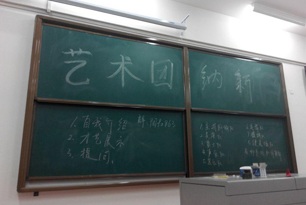 2014年10月10日中午在学前新实训教学楼6010教室,学前教育学院艺术团进行了成员的纳新及淘汰赛。参与本次纳新面试及淘汰赛的评委有艺术团团长,民舞队长,声乐队长,主持队长,模特队长,爵士队长,表演队长。此次活动中将纳入有才艺的新成员和淘汰不合格的旧成员。