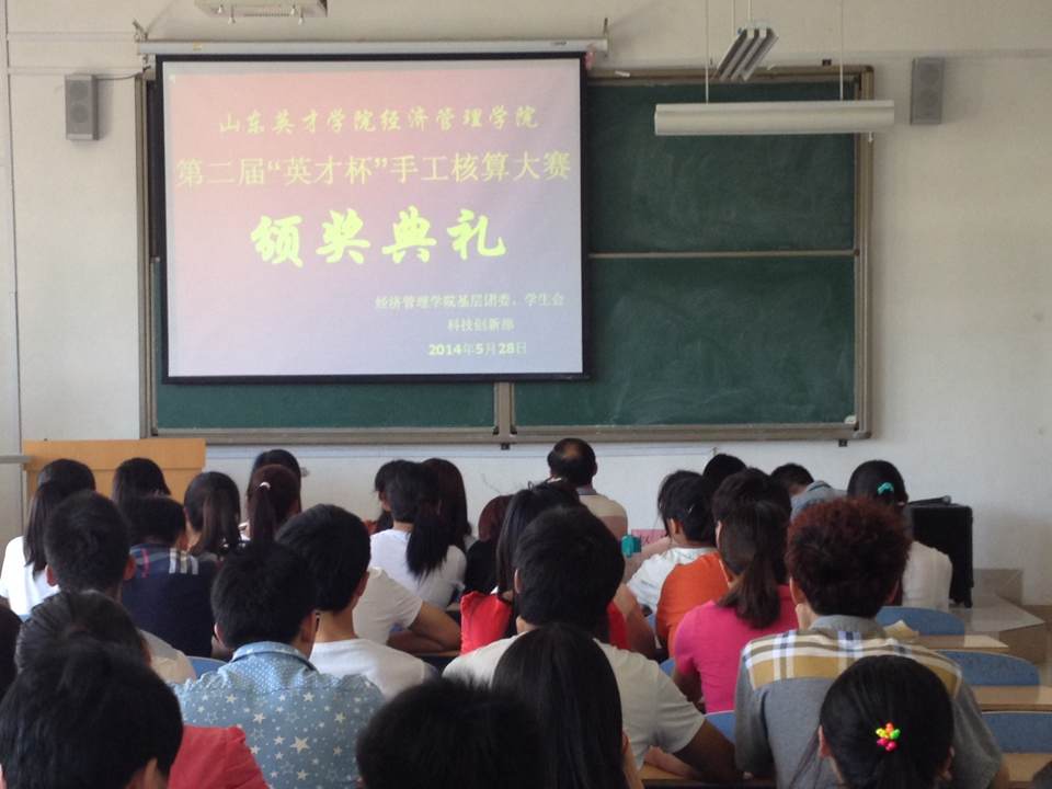 为表彰第二届“英才杯”手工核算大赛中获奖的同学,激励更多经管学子参与学术性大赛,经济管理学院于2014年5月28日在教学楼B-208举行颁奖典礼。出席本次颁奖的领导有经济管理学院行政院长王广柱,教学院长李众宜,基层团委书记赵昆。经济管理学院基层团委、学生会各部门负责人、各班级主要负责人以及全体参赛选手参加颁奖典礼,本次典礼由经济管理学院学生会主席田萌春主持。
