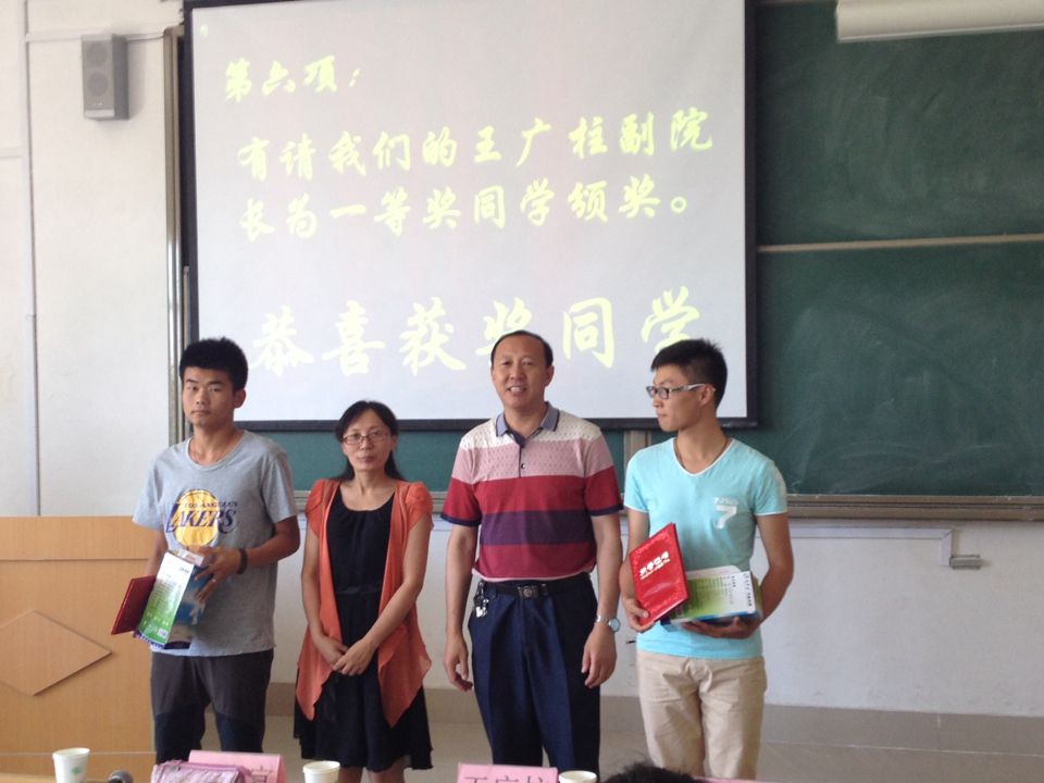 典礼在肃穆的国歌下拉开帷幕,与会人员跟随PPT回顾了大赛的整个历程,之后,经济管理学院基层团委赵昆书记隆重宣读关于本次大赛获奖先进个人的表彰文件。经过层层角逐,共有16名同学荣获佳绩。其中,胡黎明、马鑫锐荣获一等奖,李会玲等6名同学荣获二等奖,乔卉郁等8名同学荣获三等奖。在颁奖仪式上,王广柱院长、李众宜院长、赵昆书记分别为一等奖、二等奖、三等奖获奖同学颁发荣誉证书和奖品。颁奖典礼最后,李院长做指导性总结,在总结中,李院长首先转达了刘超院长对本次大赛的重视,然后向在参与和筹备本次比赛的各位老师和同学们表示感谢,最后李院长提出像这样有意义的比赛应该多办,办好,让更多的同学都可以参与进来,发挥专长。鼓励获奖的同学戒骄戒躁,再接再厉。