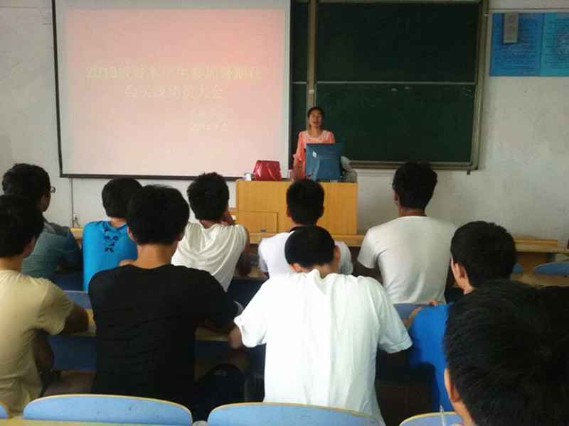 为深入学习宣传贯彻党的十八届三中全会精神、习近平总书记系列重要讲话和在北京大学师生座谈会上的讲话精神,全面贯彻落实《国家中长期教育改革和发展规划纲要(2010~2020年)》、教育部相关文件精神及《[院团字(14)27号]关于组织2013级普通本科学生参加2014年暑期社会实践活动的通知》,组织引导广大青年学生在深入社会、了解国情、接受锻炼的过程中培育和践行社会主义核心价值观,牢固树立跟党走中国特色社会主义道路、为实现中国梦努力奋斗的理想信念。机械学院于2014年7月2日12:00在实训北楼4004召开了2013级普本学生参加暑期社会实践动员大会。会议由高珊珊老师主持。