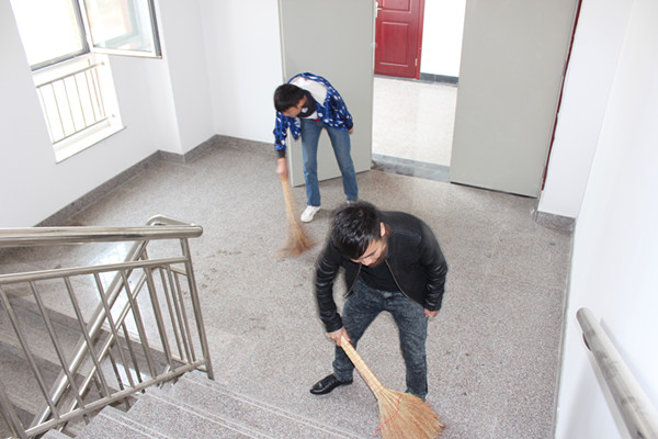 随着商学院新教学楼搬迁工作的结束,2014年10月8日,为了创造一个整洁有序的工作学习环境,商学院在商学院教学楼进行校园卫生清扫工作,商学院基层团委学生会常委团成员拿着清洁工具来到了教学楼,参加本次清扫工作。
