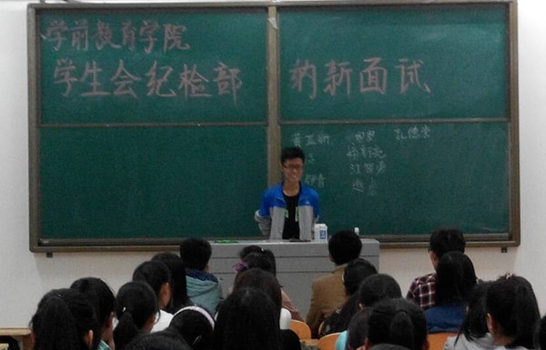 为了进一步加强团学队伍建设,为团学队伍注入一股新鲜血液,为新生创造一个展示自我的舞台,发挥自己才能的平台,学院特面向14级新生公开招选基层团委、学生会各部门干事。2014年10月10日17时,学前教育学院学生会纪检部再次纳新面试活动在学前新实训教学楼5004顺利召开,逾百人参加了此次面试。