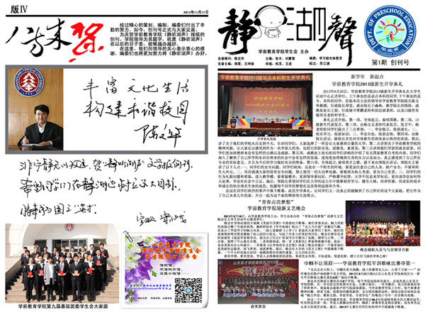 “静听湖声”是集学前教育专业知识、团学活动、校园服务、美文欣赏等多板块构成的综合性报纸。它的成长牵动着学前人的心,饱含着学前学生会的付出与成果。