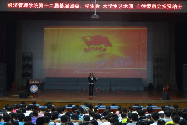 随着今年工商企业管理专业大一新生迁入南校区,并且为保证南北校区团学工作有序开展,2014年9月2日,经济管理学院基层团委学生会以及大学生艺术团前赴南校,再次拉开纳新工作的序幕。此次部门展示在南校区大学生活动中心隆重举行,出席本次纳新活动现场的嘉宾有经济管理学院赵昆书记,主席团成员,大学生艺术团代表,各部门部长、副部长以及2014级工商企业管理专业的同学。
