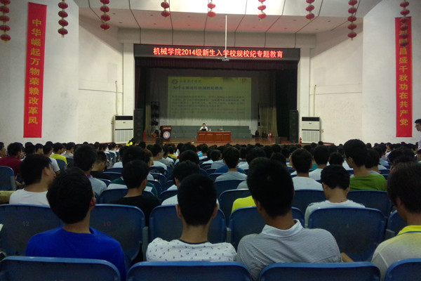 新生入学教育是大学生进入高校的第一课,也是引导和帮助新生尽快融入大学生活,尽快完成从高中生向大学生的转化的重要一课。为帮助新生按照学校的教育教学规划和目标,刻苦学习文化知识,顺利完成学业,实现学校的人才培养目标具有十分重要的意义。为做好2014级新生入学教育工作,8月28日晚6时,机械学院组织2014级新生在大学生活动中心参加了“奋斗的青春最美丽”山东英才学院新生入学教育嘉年华活动之“校纪校规专题教育”大会。本次专题教育大会由机械学院行政副院长孔祥泉教授为全体新生进行授课。