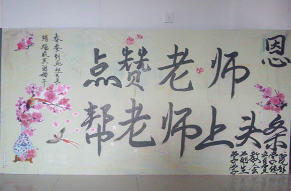 展板主题是点赞老师,帮老师上头条,最近几年里网络经常出现的一个字“赞”,这一次,也给老师点一次赞!这里的赞包含了对师长的殷切的期望和由衷的感谢。期望老师身体健康每天有笑容,感谢他们对学生的关爱与教导,赞扬其无私奉献的伟大精神!展板整体都有梅花,梅花代表着坚强,代表着无所畏惧,老师就像一朵梅花,承受着很多,但是却一直坚强,不放弃,不放弃自己任何一个学生。展板上面有一个大大的恩字,老师对学生的恩情大如天,宽如海,这份恩情,每一个学生都要铭记在心里,这个恩字提醒了他们要感恩,感恩授于自己知识的老师。这次的展板醒目地提醒着全体师生教师节的来临,告诉学生要心存感恩之心,赞扬老师这种像蜡烛一样燃烧自己却照亮别人的高尚品德。