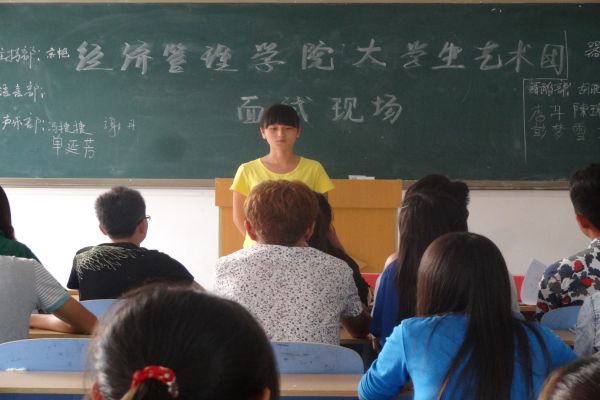 为丰富大学生的课余文化生活,发现一批有文艺气息的新生力量,为艺术团注入新鲜血液,2014年9月10日下午16:30,经济管理学院大学生艺术团在教学楼B-213教室开展新生面试活动。经济管理学院大学生艺术团团长李作恒、副团长刘向峰以及秘书处、主持部、声乐部、器乐部、演艺部、舞蹈部六个部门的部长作为本次面试官,30多名报名者参与面试活动。