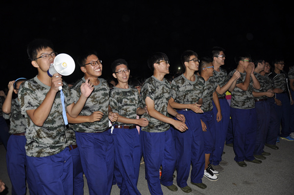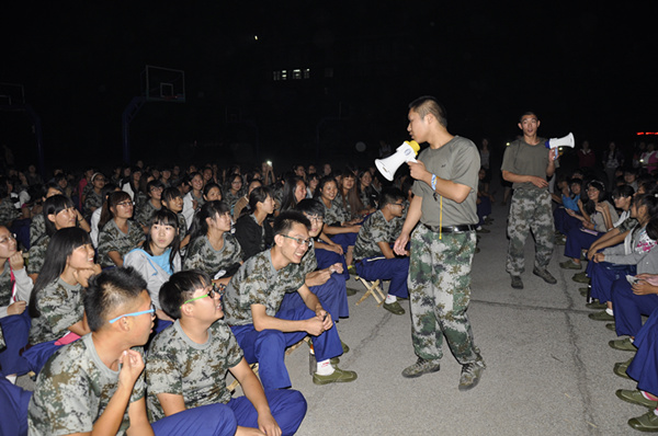 夜色如墨,在教官的带领下大家围坐一起,尽情享受军训生活中欢乐的氛围。从教官那里学生学会了许多拉歌口号,那些词语读起来朗朗上口,铿锵有力。等学生们学到了基本的技巧之后,一个个都情绪高亢,想和别的营队较量一番。各营队间由此形成了“对仗”的阵势。学生们在教官的一声令下,唱响了一首首脍炙人口的军歌,他们张大了嘴巴,放开了歌喉,一声高过一声,一浪盖过一浪,随着教官的手势和节拍不断变化着,整个训练场上充满着铿锵有力的军歌声,鼓掌和喝彩声此起彼伏,让观众的激情瞬间即被点燃。每一个人都很兴奋,激动,让他们在严苛的军训之余也轻松许多。