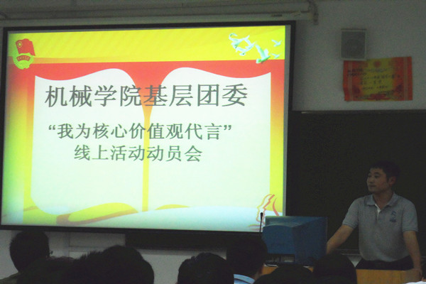 我为核心价值观代言,传递青春正能量。为了响应团中央“我为核心价值观代言”主题线上活动,在院团委的号召下,机械学院基层团委于2014年9月14日在实训南楼4012召开了“我为核心价值观代言”线上活动动员会。活动由机械学院基层团委书记刘阁主持,机械学院全体团学干部参加。