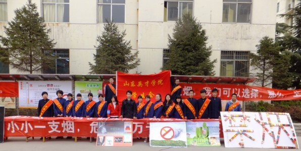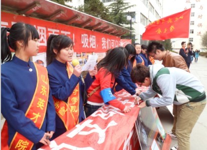为创建“无烟校园”,给广大师生营造一个无烟、清洁、健康的学习、工作和生活环境,进一步呼吁广大学生注重身心健康,关爱他人生命健康,净化身边环境,促进社会文明和谐。2013年3月28日11:30,由山东英才学院团委主办,校学生会文艺部承办的“无烟校园”签名活动在南校区大学生活动中心前举行,参加本次活动的人员有:山东英才学院团委副书记、校学生会秘书长王东生,校学生会副主席王照威,文艺部部长蒋凯强及各部部长、副部长和全体部员等。