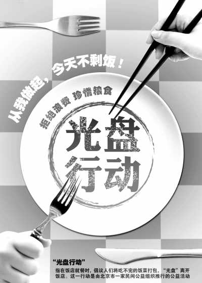 有一种节约叫光盘,有一种美德叫光盘。所谓光盘,就是吃光你盘子中的食物。当前,餐桌上浪费的粮食数量巨大,“舌尖上的浪费”触目惊心,身边的浪费比比皆是。我国每年浪费食物总量折合粮食约500亿公斤,接近全国粮食总产量的十分之一,最少倒掉了约2亿人一年的口粮。为了进一步弘扬中华民族勤俭节约的美德,大家一起来向“舌尖上的浪费”说“NO”。为此,我们向全校师生发出“光盘行动”倡议: