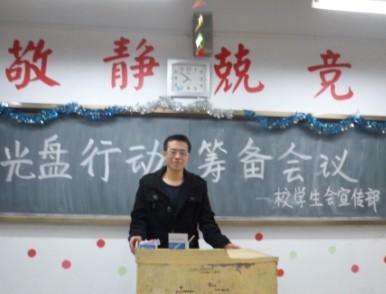 为了贯彻落实《山东省教育厅贯彻教育部关于在高等学校开展反对餐桌浪费专项行动的通知》和学院相关文件精神,弘扬中华民族“节约光荣,浪费可耻”的传统美德,建设勤俭节约、卫生文明的优美校园,2013年4月10日,校学生会宣传部在D楼4006教室召开“光盘行动”活动之筹备会议。出席本次会议有:校学生会宣传部部长吴文龙和副部长李丽君。校学生会宣传部全体干事参加了本次会议,会议由吴文龙主持。