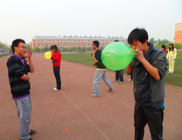 在进行团队展示之后,每队派出了三个男生和三个女生进行七彩连环炮的游戏,这个游戏就是比在制定的时间内哪个队的吹破的气球最多,在这个游戏进行的时候大家都在为自己的队员加油,而吹气球的同学也是非常卖力的吹着,因为他们知道他是代表着整个队的。尽管他们双颊通红但是他们仍然在尽力的吹着,尽管他们嗓音已经沙哑但是他们仍然在大声的喊着加油。此时此刻大家的心情是激动的,愉快的。在不知不觉中心与心的距离拉近了。