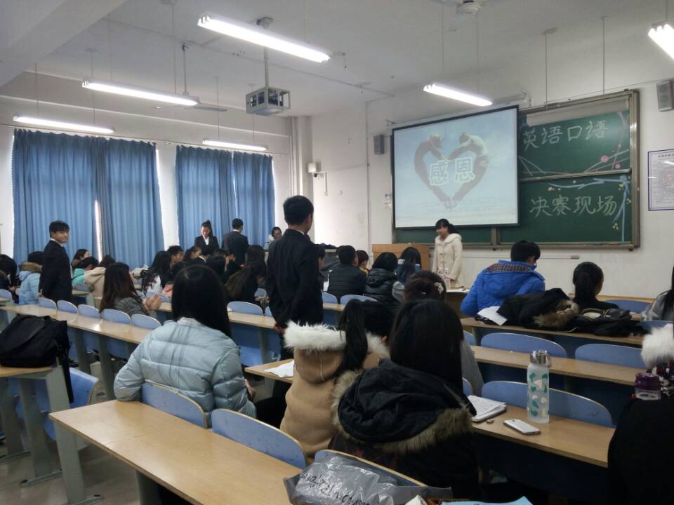 为了给同学们一个展示自己出色的英语口语的机会,山东英才学院北校区英语俱乐部于2015年11月12日中午11:30分在经济管理学院教学楼308室举办英语口语大赛决赛。出席此次会议并担任评委的有团委负责人丁明辉,社团联合理事会主席刘万元,大学生艺术团团长侯梦雨,青年志愿者协会会长杨恒东,文法学院副主席袁盼盼,园林学院副主席魏梅玉,大学学生会外联部部长万武,广播站组织部部长赵纪民,老师推荐学生代表赵思佳等。参与本次英语大赛的还有英语俱乐部的全体成员,本次决赛由英语俱乐部主办。