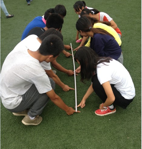 在做齐眉杆游戏的时候,我们将十人分为一组,在进行简单的讲解和试验之后,给他们时间做准备,从最开始兴奋、轻松,慢慢的大家抱怨、丧失信心,一次又一次失败,最后我们给他们最大的鼓励,让他们学会动脑。在经过大家一上午的努力之后,每组人员都成功的完成了游戏。相信这场游戏,不仅仅只是玩,也让他们学到了团结和团队的重要性。