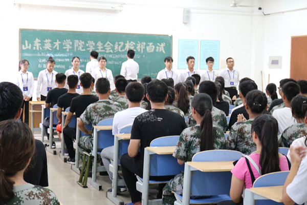 璀璨阳光,秋风拂面。为了学生会全方面人才的发展,并学生会注入新鲜血液。山东英才学院学生会纪检部于2016年8月23日在宗教南楼5001,5002,5003进行初次面试及开会。本次学生会纪检部初试负责人由学生会纪检部部长袁凯淇及副部长张乐雷担任。本次面试来的嘉宾有学生会副主席李伟及纳新负责人赵希望。本次面试的面试官由纪检部优秀骨干担任。