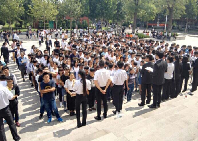 中午11:40校学生会各部门的部长、副部长及负责人已身着正装站在大学生活动中心的门前。面试的人员也都陆陆续续的聚集在广场上,自觉站队,每个部门男女两列,跨立站好。至11:50,面试人员已基本到齐,各部门点完名之后到12点负责人带领面试人员到了经管楼,秩序井然,为校学生会树立了良好的形象。到了指定地点后,各部门负责人向面试人员提点了一下面试要注意的礼仪,以免犯不必要的错误。之后,按照点名的顺序,面试人员手持报名表开始排队面试。由于外联部人员较多,开设了两个面试点,此举大大减少了同学们的等待时间。也由于时间有限,各面试人员的面试时间基本控制在两分钟左右。时间虽然很短,但各位面试人员依旧认真对待这次面试,将自己最优秀的一面展现给了面试官。面试官也根据面试人员不同的自我介绍提出了不同的问题。面对面试官的提问,面试人员冷静思考,认真作答,结果都很令人满意。而站在教室外面等待面试的人员虽然怀着紧张的心情但在负责人的管理下依旧保持冷静,严肃的态度,嬉戏打闹的现象几乎没有。期间,主席贾欢、副主席郭剑都来到了面试现场,对面试工作进行了指导。