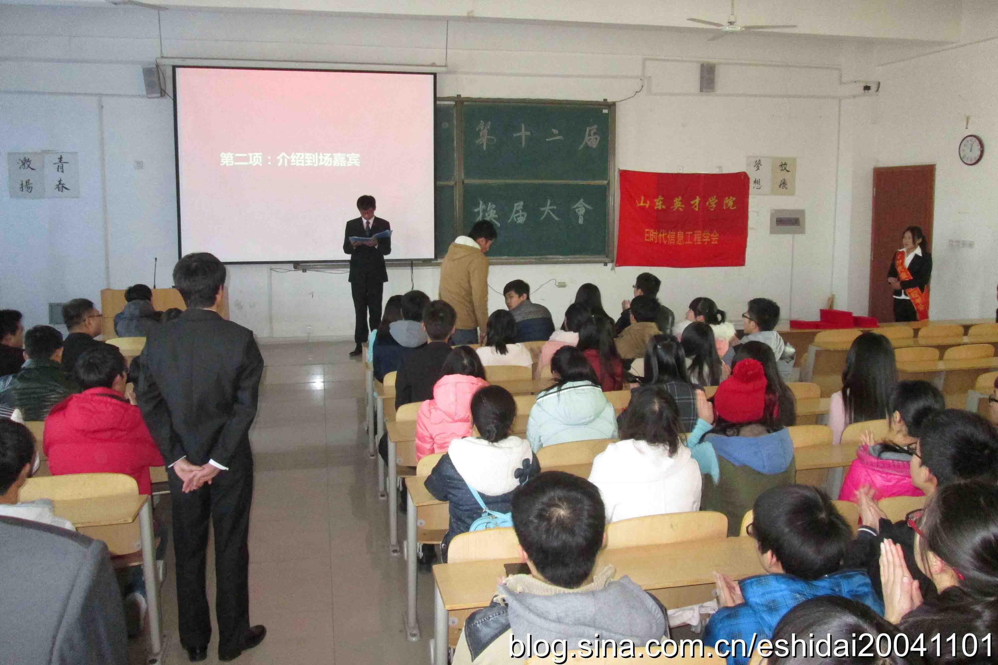 2014年12月13日中午11点30,E时代信息工程学会在综教楼北楼5010举行第十二届换届大会,出席人员有上届主席、副主席及各部门部长,还有社联主席与副主席等嘉宾。