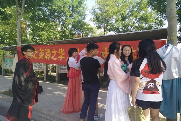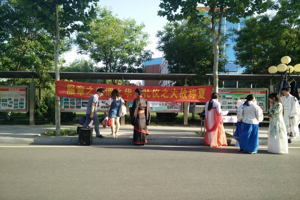 为了让当代大学生认识我们的名族服饰――汉服,以求共同弘扬中华名族传统文化。山东英才学院夏裳汉服社于2015年5月19日在食堂北门开展拉横幅签字、试穿汉服活动。本次活动由负责人蒋思宇、吉绍绍以及部分社团成员积极参与。